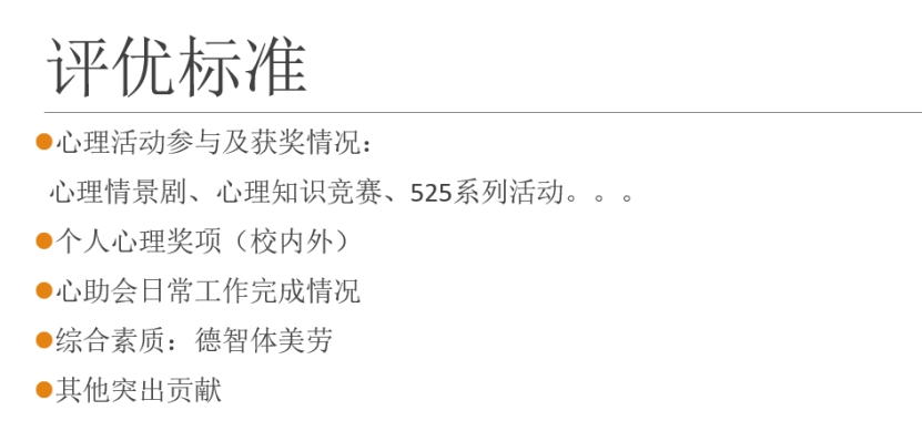 接着,会长王琼婕向我们展示了本次评选的评优标准。根据过去一年外语院心助会与学校开展的相关心理活动,如心理情景剧、心理知识竞赛、525系列活动等,此次评优设置了心理活动参与及获奖情况这一标准。考虑到心助会成员参与评选的情况,添加了心助会日常工作完成度这一标准。除此之外,还有个人心理奖项(校内外)、综合素质以及其他突出贡献等参考标准。