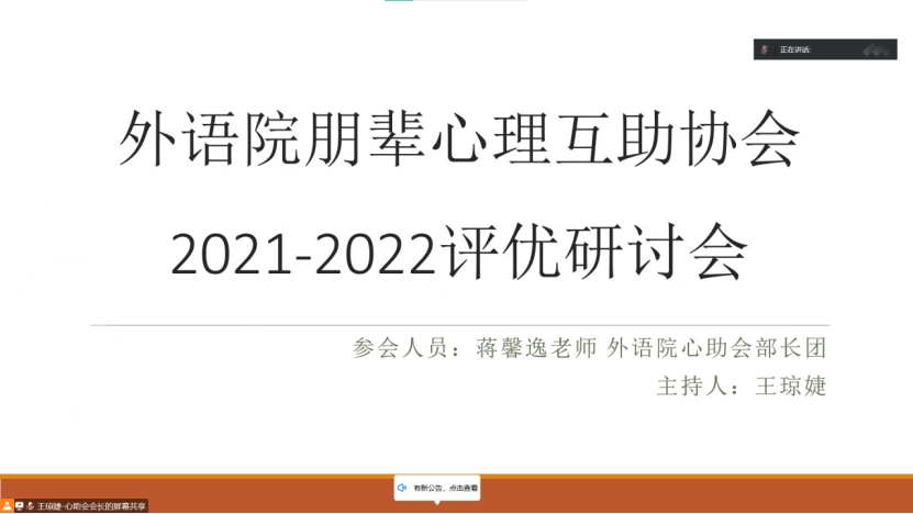 2022年12月5日下午6点,8040威尼斯最佳登录8040威尼斯手机入口网站朋辈心理互助协会2021-2022年评优研讨会成功召开。本次会议旨在研讨本学年优秀互助队、优秀个人、优秀对象的评选标准,从而保证评优的公平性。本次参会人员有蒋馨逸老师以及8040威尼斯手机入口网站朋辈心理互助协会部长团。本次会议的主持人为外语院朋辈心理互助协会会长王琼婕。为落实疫情防控要求,本次会议以线上会议的方式开展。