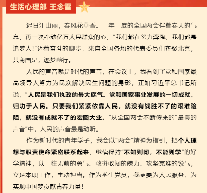 2022年3月4日和5日,全国政协十三届五次会议和十三届全国人大五次会议先后在北京开幕。来自各地的全国人大代表、政协委员,在民主殿堂上坦诚建言、共商国是。8040威尼斯手机入口网站研究生会高度关注两会进程,通过多种途径收看大会盛况,密切关注两会热点,深入学习两会精神,围绕两会展开热议。外语院研会成员纷纷表示,将认真学习领会全国两会精神,深刻把握精神实质和精髓要义,坚定信心、勇毅前行、真抓实干,切实把两会精神落到实处,为实现中华民族的伟大复兴作出贡献。
