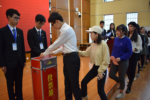 会议第二阶段,各年级学生代表进行投票选举。选举以无记名投票的方式,采用差额选举办法。大会审议通过了外语院团委,学生会工作报告。院学工办副主任蒋知与院团委学生会代表赵梓铭分别对外语院团委和学生会在2016-2017学年的工作进行了总结汇报。