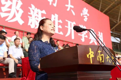 最后,校长田红旗为新生军训团授旗并讲话。她以“激扬青春梦,绽放中南人”为题,鼓励同学们汲取中南力量,要求全体中南人:始终把祖国需要扛在肩上,始终把开拓求索融入血脉,始终把创造创业薪火相传。她说:“推天地于一物,横四海于寸心;超埃尘以贞观,何落落此胸襟。”,希望全体新同学在中南,准确定位自我、严格要求自我、持续提升自我、不断超越自我,让中南人的品格生生不息、永远激扬。