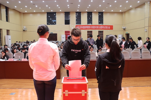 刘书记讲话后,各年级学生代表在检票员的组织下进行投票选举。选举以无记名投票的方式,采用差额选举办法。