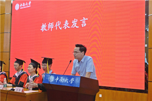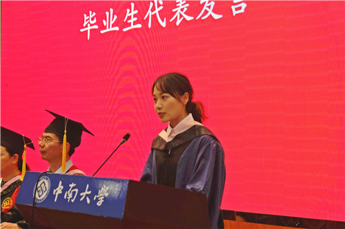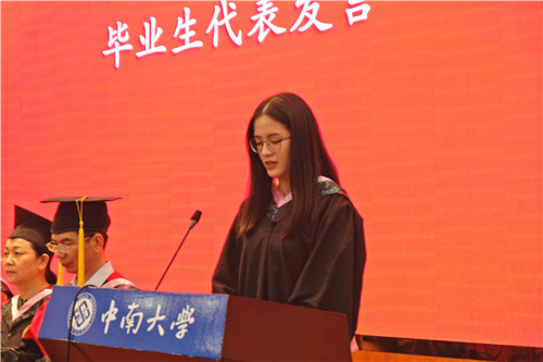 18级笔译专业的杨越作为研究生代表发言。她表示,作为中南人,应常怀感恩,终身学习,同时以天下为己任,承担更多的社会责任。并希望同学们能够将所学应用于今后的工作,经世致用,为社会和国家贡献中南人的力量。