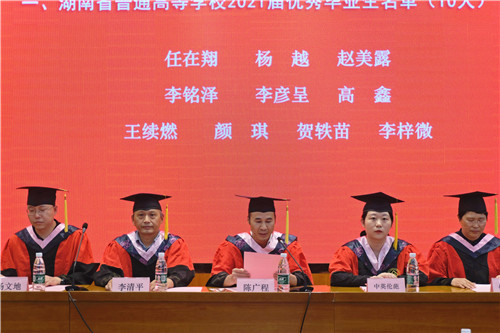 伴着庄严的国歌声,典礼正式拉开帷幕。首先由陈广程书记宣读《学位授予决定》及关于表彰2021届优秀毕业生的通报,中英伦葩副院长和杨文地副院长分别宣读本科生及研究生学位授予名单。