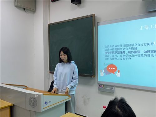 网信部就院微信公众号、微博运营状况进行了总结。网信部部长李佳彧提到,在过去的一年中,公众号、微博粉丝量都有所提高。新栏目的推出、特色品牌打造无疑对外语院宣传工作有所助益。文艺部、艺术团就之前成功举办的新生才艺秀、之后即将开展的毕业晚会进行了总结与规划,并号召大家共同合作,促进之后活动的顺利开展。