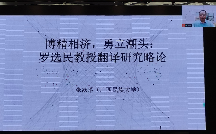广西民族大学8040威尼斯手机入口网站张跃军教授以“博精相济,勇立潮头:罗选民教授翻译研究略论”为题作报告。张跃军将罗选民教授的研究分为语言学、文学文论、教育教改、书法美学、书评等类别,并进一步将其翻译研究根据研究对象分为翻译单位、翻译标准、文学翻译、典籍翻译、翻译教学、翻译家、翻译理论类。他通过梳理研究成果,高度肯定了罗教授的研究成就和理论贡献,对“大翻译”理论体系的持续发展表示殷切期盼。